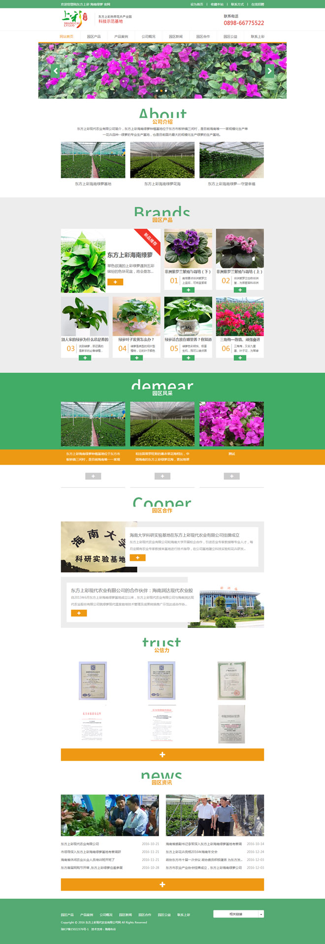 公司一直努力打造專屬于自己的農(nóng)業(yè)知名品牌,專注研發(fā)專屬于東方上彩農(nóng)業(yè)的品牌產(chǎn)品,打造“東方熱帶花卉產(chǎn)業(yè)園”,目前已引進(jìn)試種多種熱帶花卉,其主要的花卉產(chǎn)品有綠蘿、非洲紫羅蘭、網(wǎng)紋草、口紅花、萬千心、豹紋竹芋等熱帶花卉產(chǎn)品已試驗成功,并可大面積投入生產(chǎn),其主要的果蔬產(chǎn)品有芒果、紅心火龍果、鳳梨、黃皮及各種葉菜類蔬菜。公司一直追求著“三生”環(huán)保生產(chǎn)理念,做安全農(nóng)業(yè)、放心農(nóng)業(yè),近幾年公司也不斷取得了無公害農(nóng)產(chǎn)品產(chǎn)地認(rèn)定證書、ISO9001質(zhì)量管理體系認(rèn)證證書等。2016年,公司基地被海南省東方市授予“海南東方熱帶花卉產(chǎn)業(yè)園上彩熱帶花卉產(chǎn)業(yè)科技示范基地”及市重點項目。公司積極推動?xùn)|方市地域性商標(biāo)“感恩大地”,并作為試點單位積極參加?xùn)|方市溯源防偽系統(tǒng)??梢灶A(yù)見,公司目前正在探索的現(xiàn)代農(nóng)業(yè)工業(yè)化、農(nóng)業(yè)集約化的生產(chǎn)模式的成功,對擴(kuò)大生產(chǎn)其他熱帶花卉產(chǎn)品,提高海南熱帶花卉知名度具有重大意義。