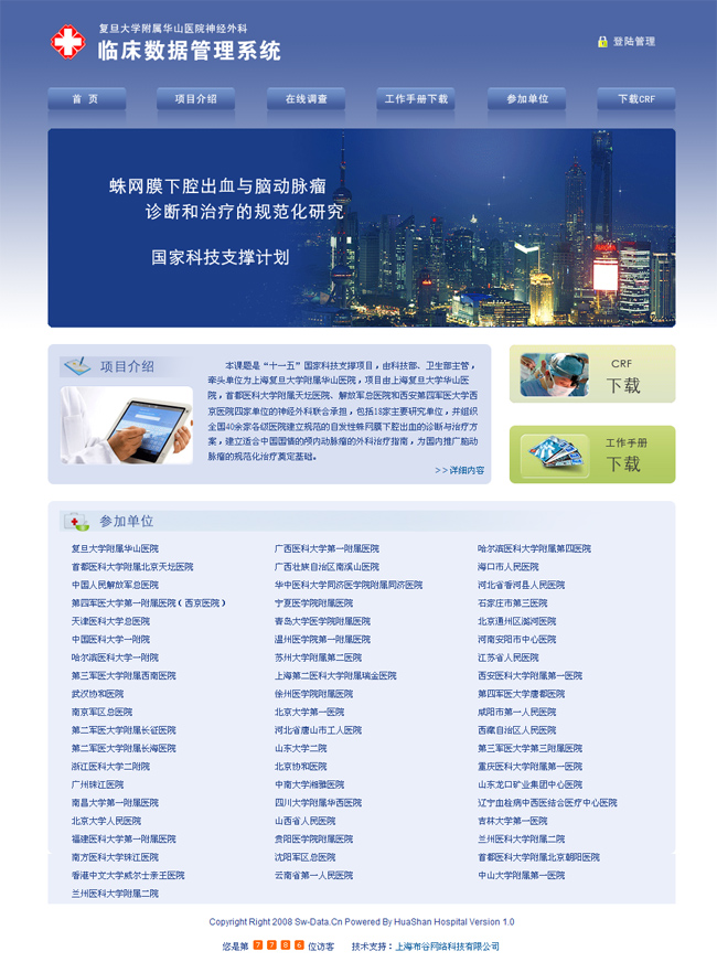 案例背景:本課題是“十一五”國家科技支撐項(xiàng)目,由科技部、衛(wèi)生部主管,牽頭單位為上海復(fù)旦大學(xué)附屬華山醫(yī)院,項(xiàng)目由上海復(fù)旦大學(xué)華山醫(yī)院,首都醫(yī)科大學(xué)附屬天壇醫(yī)院、解放軍總醫(yī)院和西安第四軍醫(yī)大學(xué)西京醫(yī)院四家單位的神經(jīng)外科聯(lián)合承擔(dān),包括18家主要研究單位,并組織全國40余家各級醫(yī)院建立規(guī)范的自發(fā)性蛛網(wǎng)膜下腔出血的診斷與治療方案,建立適合中國國情的顱內(nèi)動脈瘤的外科治療指南,為國內(nèi)推廣腦動脈瘤的規(guī)范化治療奠定基礎(chǔ)。