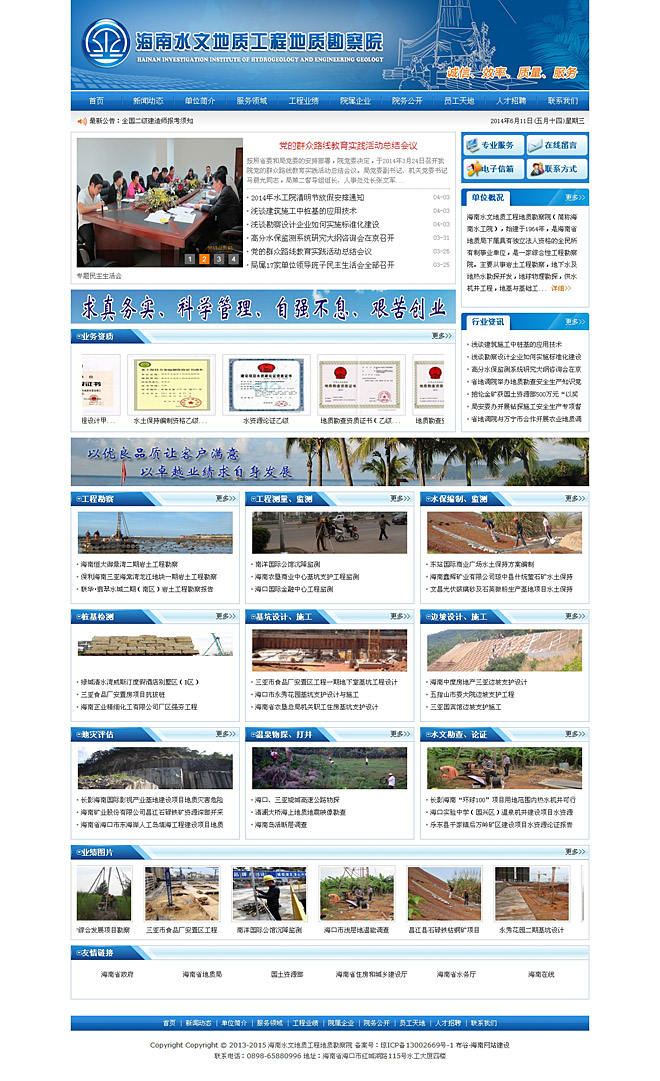 海南水文地質(zhì)工程地質(zhì)勘察院(簡稱海南水工院),始建于1964年, 是海南省地質(zhì)局下屬具有獨立法人資格的全民所有制事業(yè)單位,是一家綜合性工程勘察院。主要從事巖土工程勘察,地下水及地?zé)崴碧介_發(fā),地球物理勘探,供水機井工程,地基與基礎(chǔ)工程,市政工程,邊坡錨固工程,水利與環(huán)保工程的施工,地形測量,樁基檢測,巖土工程測試,地質(zhì)災(zāi)害危險性評估及勘查、設(shè)計、施工,水土保持方案編制與監(jiān)測等工作。持有建設(shè)部頒發(fā)的工程勘察綜合類甲級資質(zhì)證書;國土資源部頒發(fā)的地質(zhì)災(zāi)害治理工程勘查、設(shè)計、施工甲級證書及地質(zhì)災(zāi)害危險性評估甲級證書,水工環(huán)地質(zhì)勘查甲級,液體礦產(chǎn)勘查甲級,固體礦產(chǎn)勘查,地質(zhì)鉆探乙級資質(zhì)證書;水利部頒發(fā)的水土保持方案編制乙級及水土保持監(jiān)測乙級;海南省水務(wù)局頒發(fā)的建設(shè)項目水資源論證乙級資質(zhì)證書等。2006年獲得ISI9001:2000質(zhì)量管理體系認(rèn)證。