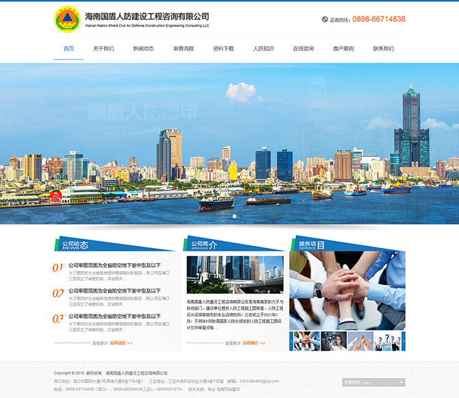 海南國盾人防建設(shè)工程咨詢有限公司是海南首家致力于為政府部門、建設(shè)單位提供人防工程施工圖審查、人防工程設(shè)計(jì)咨詢等服務(wù)的專業(yè)咨詢機(jī)構(gòu)。公司成立于2011年3月,于同年6月取得國家人防辦頒發(fā)的人防工程施工圖設(shè)計(jì)文件審查資格證?,F(xiàn)有各專業(yè)審查人員18人, 其中建筑專業(yè)4人,結(jié)構(gòu)專業(yè)4人,通風(fēng)專業(yè)3人,電氣專業(yè)4人,給排水專業(yè)3人。全部具有國家認(rèn)證的注冊工程師資格及人防專項(xiàng)審查師資格。