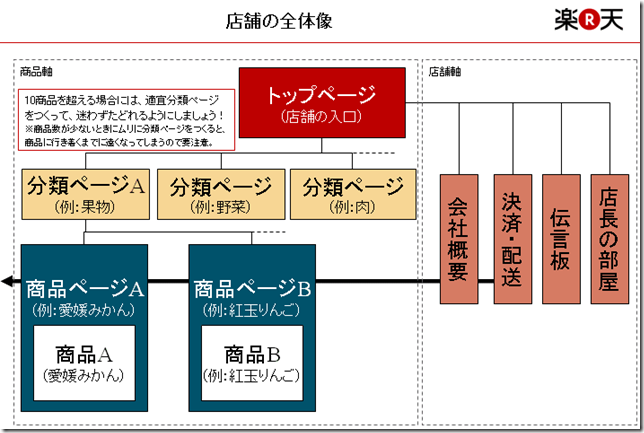 舉例來說,利用樂天RMS的Storefront來搭建一個店鋪的架構如下,橫向可以分為店鋪和商品維度,縱向的商品軸又分為店鋪–類別–具體商品,店長可以按照這個架構很方便地完成一個店鋪。